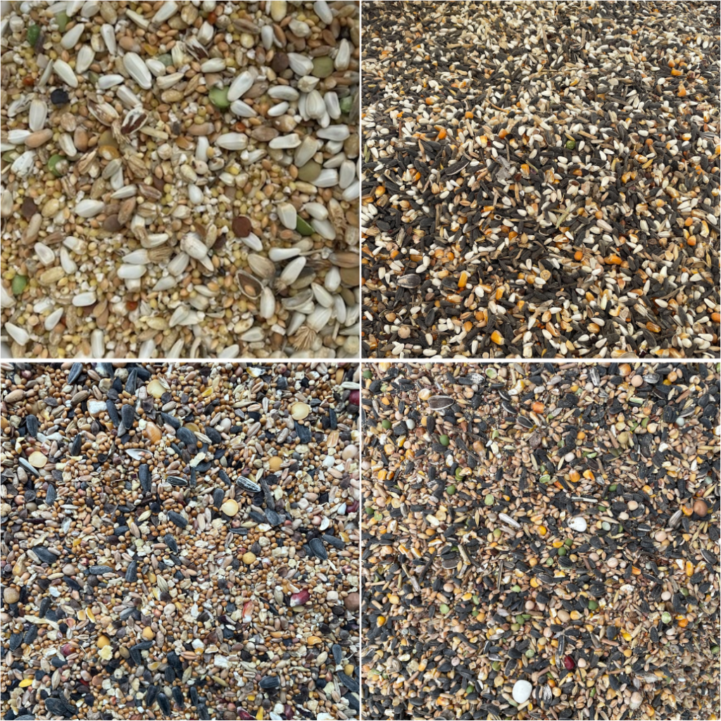 Siemię lniane, Gorczyca, Proso czerwone, Proso żółte, Mozga kanaryjska, Owies bezłuskowy, Proso zielone, Sorgo białe, Sorgo czerwone, Proso białe, Rzepak, Kasza jaglana, Gryka, Soja, Kukurydza, Pszenica, Słonecznik, Krokosz (kardi).